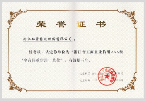 日前,我公司再次被浙江省工商行政管理局續展認定為“浙江省工商企業AAA級‘守合同重信用’單位”。
