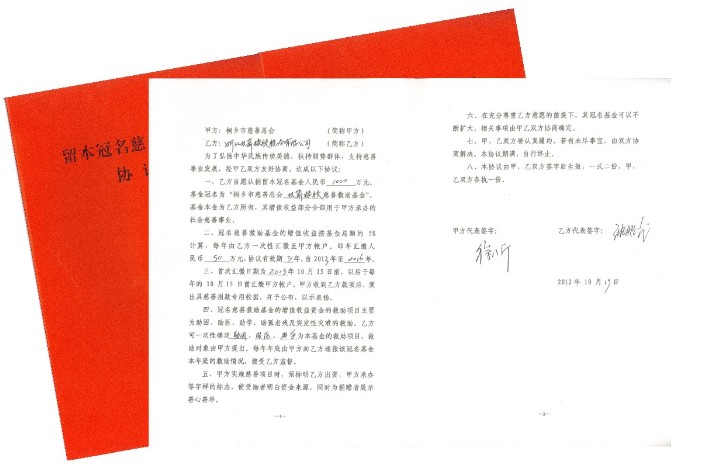 當天會場還舉行了企業留本冠名基金簽約儀式。我公司大力支持慈善事業,自愿認捐留本冠名基金1000萬元,其增值收益資金全部用于桐鄉市慈善事業,助困、助醫、助學、助孤老殘及突發性災難救助。“行有道,愛無界”,雙箭愿與市慈善總會一同努力,在扶貧助困、促進和諧社會建設中作出更大貢獻。