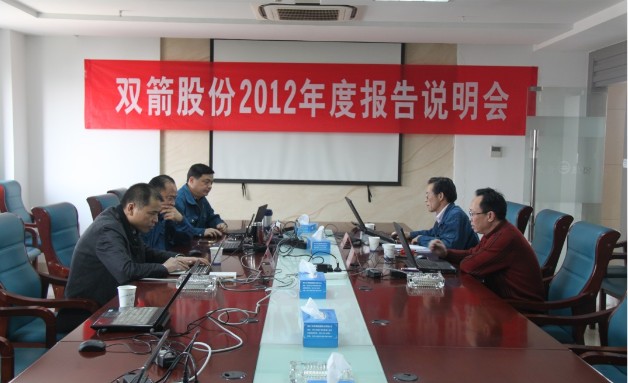 3月8日下午,召開了“雙箭股份2012年年度網上業績說明會”。公司董事長沈耿亮、副董事長兼總經理沈會民、副總經理兼董事會秘書陳柏松、董事兼財務總監沈林泉、獨立董事陳勇和保薦代表人盧旭東出席了本次年度業績說明會。
