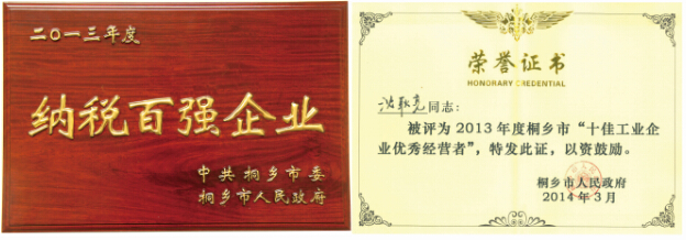 會議由桐鄉市盧躍東書記主持,首先為2013年度納稅百強企業、工業企業優秀經營者、科技進步企業、創業創新領軍人才頒獎。我公司榮獲“2013年度納稅百強企業”稱號,同時董事長沈耿亮獲得桐鄉市2013年度“十佳工業企業優秀經營者”榮譽稱號。沈總接受表彰并與獲獎企業代表們合影留念。