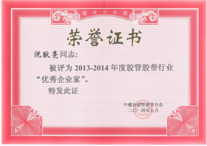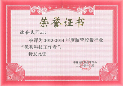此外,為鼓勵膠管膠帶行業的廣大企業經營管理者在認真貫徹落實科學發展觀,推動產業轉型升級等方面的積極貢獻,同時為表彰先進、樹立榜樣、充分發揮優秀企業家和科技工作者在行業發展中的帶頭示范作用,落實工信部對協會工作的要求,按照中國橡膠工業協會膠管膠帶分會制定的“膠管膠帶行業優秀企業家評定辦法”和“膠管膠帶行業優秀科技工作者評定辦法”,我公司董事長沈耿亮被評為“2013-2014年度膠管膠帶行業優秀企業家”,總經理沈會民被評為“2013-2014年度膠管膠帶行業優秀科技工作者”。